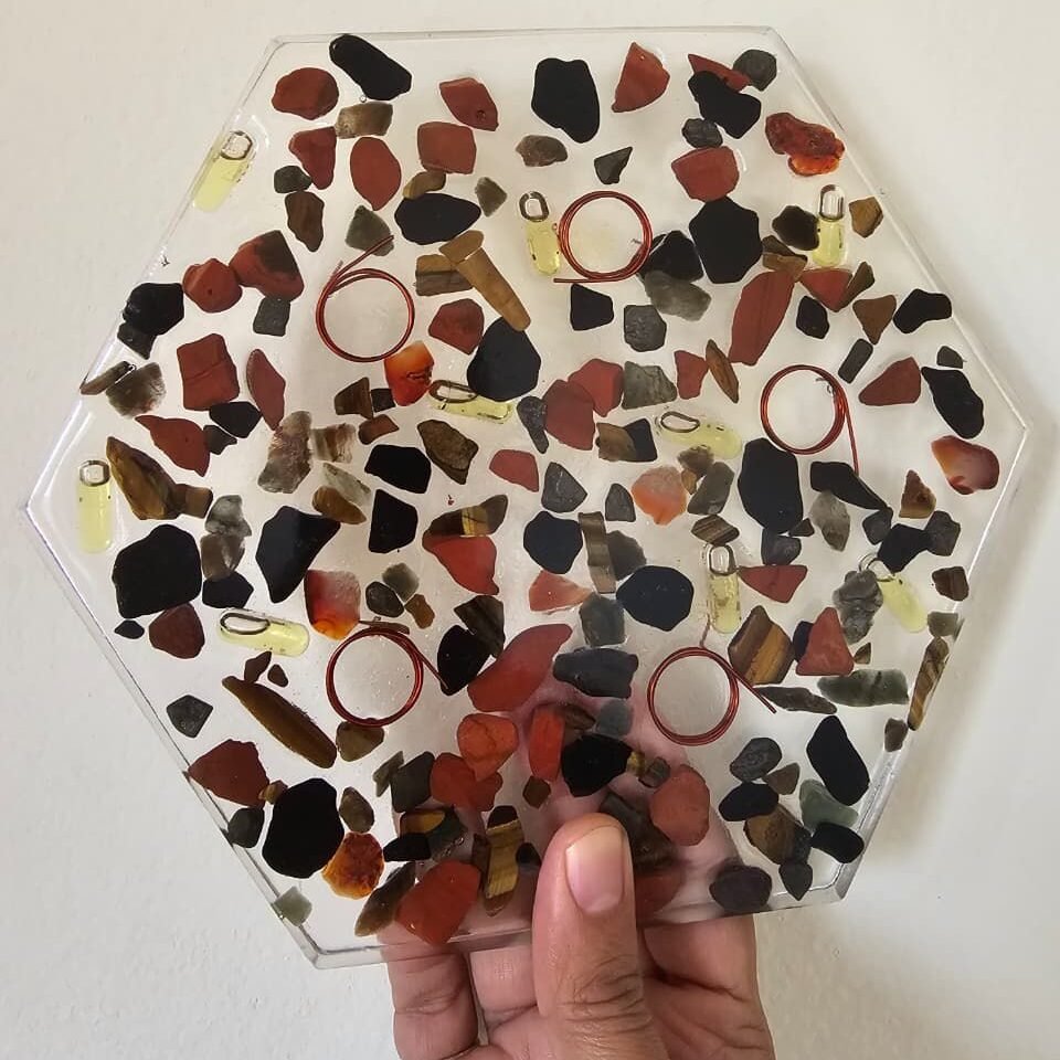 This Crystal Energy Grid is a handcrafted fusion of earth’s grounding stones Red Jasper, Tiger’s Eye, Black Tourmaline, and Carnelian, blended in resin and charged with pure intention.